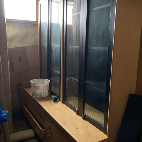 Siisti kaappitaso vitriinillä ja laatikoilla muunneltavissa