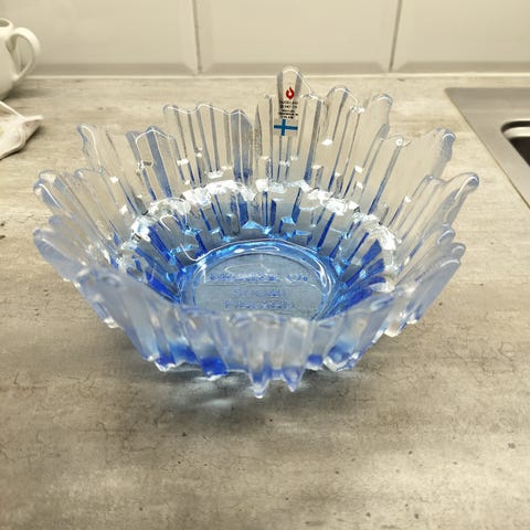 Kaunis ja ehjä lasikukko. Pituus 10cm, korkeus 9,5cm. Edessä tarra jossa lukee Lahti