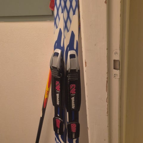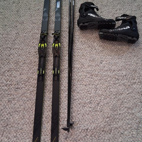 Kuvien mukaiset, muutaman kerran hiihdetty pieni lenkki. Salomon SNS siteet 60 kiloiselle asennettu. Monot SNS 42 koko. Sauvat 133 cm. Nouto Jämsän Alhojärveltä.