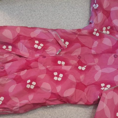 Hyväkuntoinen Reimatec talvihaalari, koko 92. Harmaalla pohjalla valko-pinkkejä kukkasia. Edessä yksi vetoketjutasku. Huppu irrotettavissa. Toinen lenksu lahkeessa korvattu kuminauhalla. Polvissa ja takana aavistus kulumaa, ks kuva.