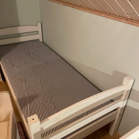Vanha ikean kerrossänky ala laatikolla. Jonkun verran käytön jälkiä. Kunnon puuta eikä mitään lastulevyä. Ei saa purettua. Patjat löytyy myös