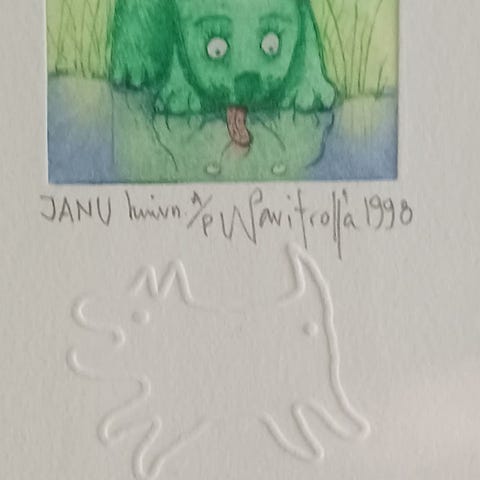 La Casa Desdemona. Epäselvä signeeraus vuodelta 1959. Työn korkeus on 40 cm ja leveys 32 cm. Kehys 52 X 43 cm.