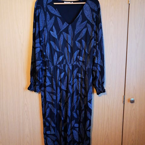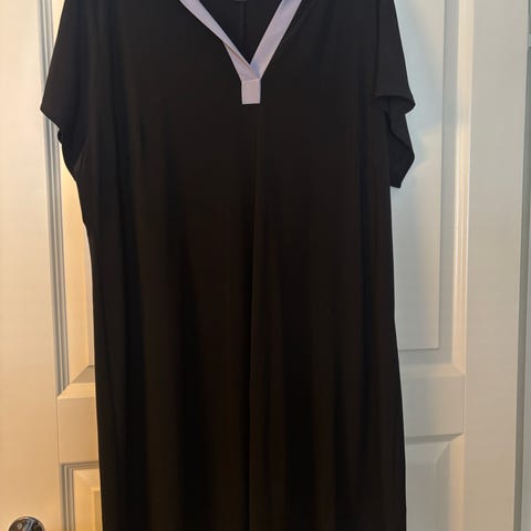 Hyväkuntoinen, muutaman kerran käytetty Creamin trikoomekko. Musta, harmaankirjava etu- ja takakaistale. Sivussa piiilovetoketju. Pituus olkapäästä helmaan 103 cm, kai-kai 56 cm.