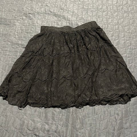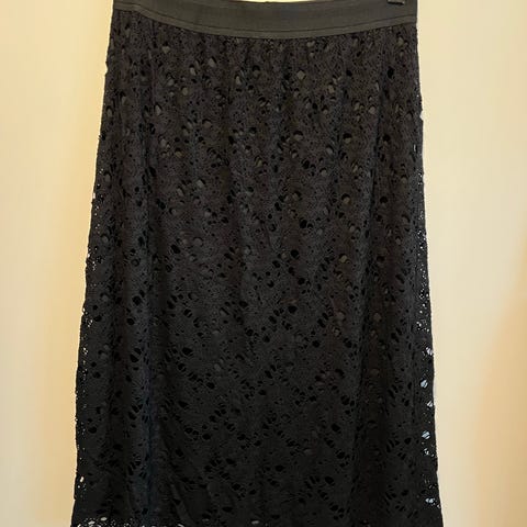 Musta joustava pitsihame, joustaa ja vuori joustava. Pituus vyötäröstä helmaan 57 cm. Käyttämätön.