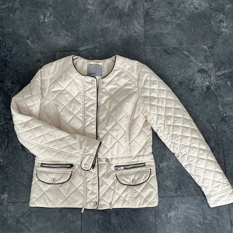 Santarelli merkkinen tikkitakki, lukolliset taskut ja lukollinen sisätasku. Alareunasta muutama langanpäätä hieman irti, muttei pilaa kokonaisvaikutelmaa. Takki on beige, kuvissa näyttää hieman liian harmaalta.