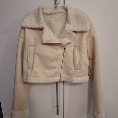 Hieman kimaltava vaaleanbeige takki, en löydä kokomerkintää, mutta mielestäni iso M tai L. Taskut ja pari sisätaskua. Kunto hyvä, käytetty.