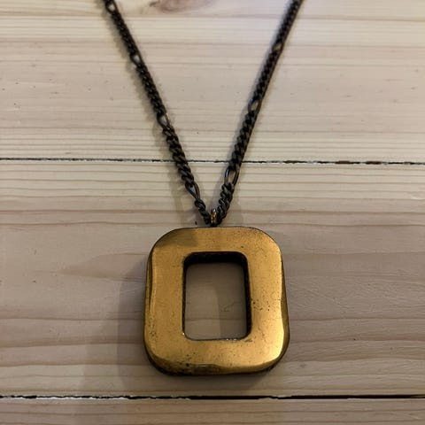 Pentti Sarpaneva, kaulakoru, pronssia. Ketjun pituus 32 cm, riipus 4,5 cm x 5 cm. Leima P. Sarpaneva. Ainoastaa nouto ja käteisellä.