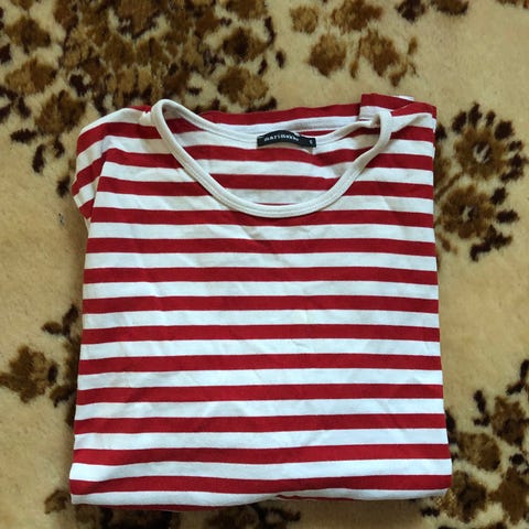 Hyväkuntoinen sinimusta raitapaita kokoa S. Mitta kainalosta kainaloon 49,5 cm ja olka-helma pituus 65 cm. Taloudessa ei ole kotieläimiä.
