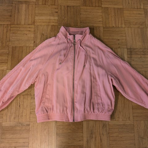 Kaunis käännettävä bomber-takki, jossa toisella puolella upeat kukkakirjailut ja toinen puoli vaaleanpunainen valkoisilla hihoilla.