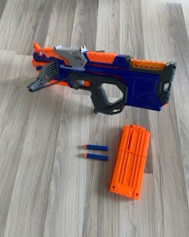 Nerf jousipyssy, jossa 4 nuolen makasiini. Ampuessa voi heti ampua uuden lataamatta välillä, kunnes makasiini on tyhjä. Helppo ladata nopeasti uudestaan.