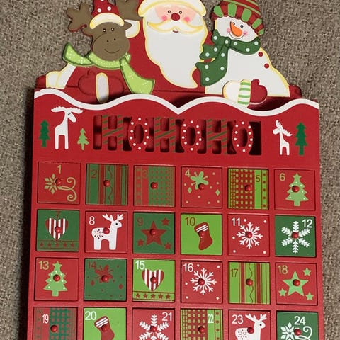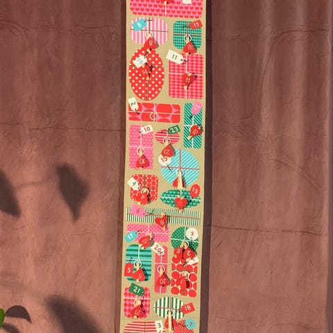 Joulukalenterina ostettu aikoja sitten mutta sopii myös seinälle kauniina seinäkoristeena. Siisti ja ehjä. Mitat on 58x45.
