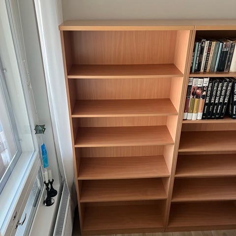 Siisti kirsikkapuinen kirjahylly. Hankittu muistaakseni Vepsäläiseltä. Kalustepyörät asennettu jälkeenpäin: 4 kulmissa + 1 keskellä (kumi rikki, pitää vaihtaa jos haluaa pitää pyörien päällä). Voidaan purkaa siistiin nippuun noutoa varten.