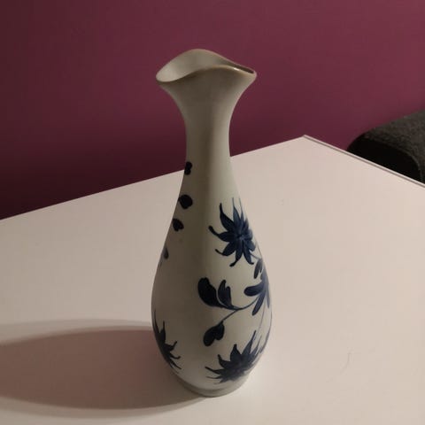 Kaunis herkkä käsinmaalaus. Taiteilija, en saa kirjaimista selvää. Kuitenkin 1960 luvun Arabia taide tuotantoa. Ehjä ja hyvä. On niin kaunis että en ole raskinnut käyttää. Lasivitriinissä ollut teko pikarililja kukat siinä olleet. Arvotuote. Hinta 55 euroa