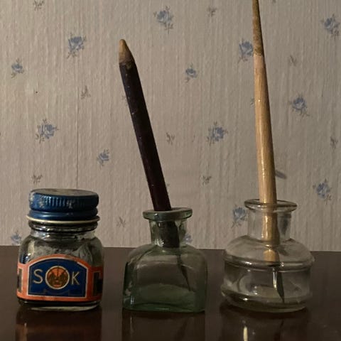 Aika ennen kuulakärkikynää akvilan mustepullo ja siihen löytynyt laatikko laatikon sisällä kovikkeita jotka pitävät muotoa yllä. Nyt myös myynnissä Helsingin leimasintehtaan käyttämätön peltirasia mustetyyny tämän kaveriksi mikäli haluat neuvotella.