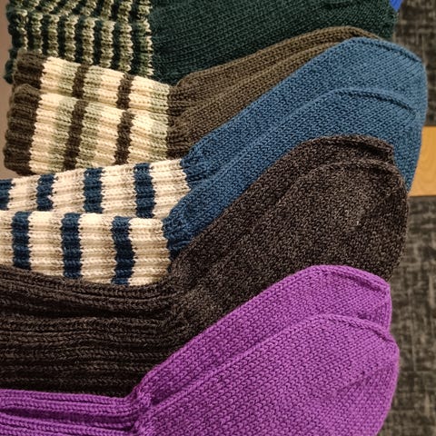 Polveen asti ylettyvät, talviaiheiset kirjoneulesukat ovat Merja Ojanperän ja kumppaneiden malli.