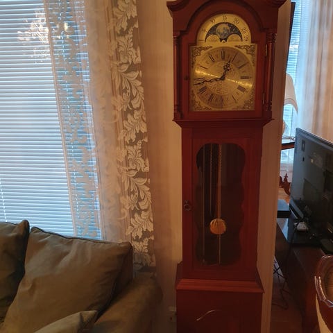 Kellokaappi korkea 182cm, leveys 57cm ja syväys 27cm. Puu väri tumma Ruskea. Itse tehnyt kellokaapin.