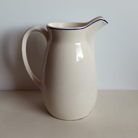 Vanha, 30-luvulta, kannu / kaadin / maitokannu, oranssi lysterifondi kukka, n. 0,5 l, malli IO, design Olga Osol?, Arabia. Kannun korkeus n. 13 cm ja yläosan halkaisija n. 9 cm. Kannu on muuten ehjä, mutta yläreunassa sisäpuolella pieni n. 0,5 cm "kropsu" (katso viimeinen kuva). Hinta 20 e. Voin myös postittaa, jolloin postimaksu on 10,90 e.