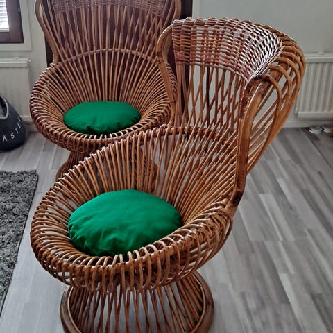 Rottinkituoleja (2kpl:tta) tammipuisilla jaloilla. Korkeus 90cm, leveys 60cm, syvyys 60cm, istuin korkeus 47 cm. Hinta yhteensä tuoleista 140€.