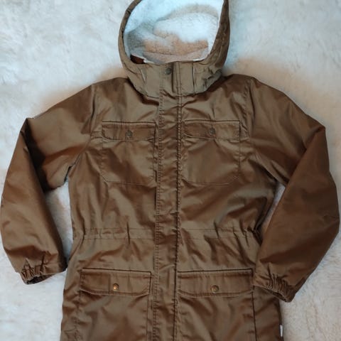 Parka-mallinen Cube co toppatakki, koko 158cm. Takissa on sekä läpälliset taskut että sivutaskut. Vasemmassa hihassa on pienenpieni viilto, joka paikattu tummansinisellä vaatetarralla. Muutoin takki on kuin uusi, eikä ole huomautettavaa.
