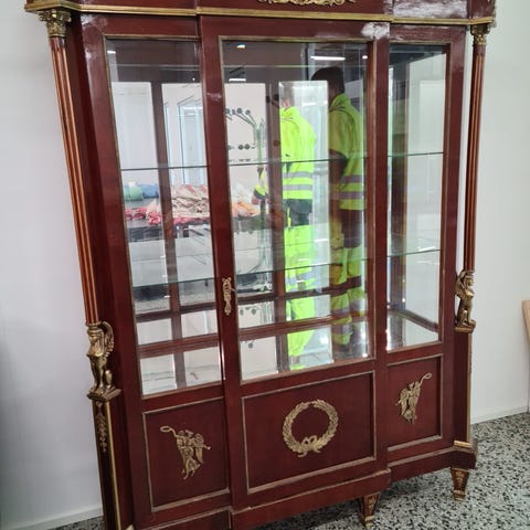 Aito omenajugend-vitriini, kaksi osainen. Koko: syv. 520mm(tason syv), lev. 1150mm(tason lev), koko korkeus 1930mm. Tasoon on sadassa vuodessa tullut käytön jälkiä. Nouto Oulu, Hiironen.