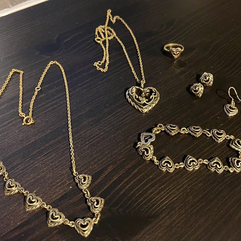 Kalevala korun pronssinen talonsydän setti sisältää kaulakorun, rannekorun, nappikorvakorut sekä 2 sormusta (koko17)