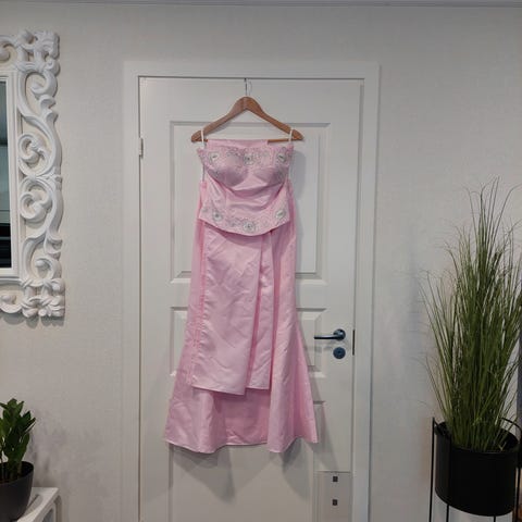 Koristeellinen juhlamekko, käytetty kerran ja pesulan pesemä. Yhdessä kohtaa helmassa pieniä jälkiä, kun juhlijan sormus tarttui mekkoon kiinni. Näkyy kuvassa.