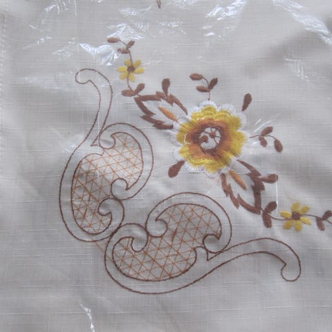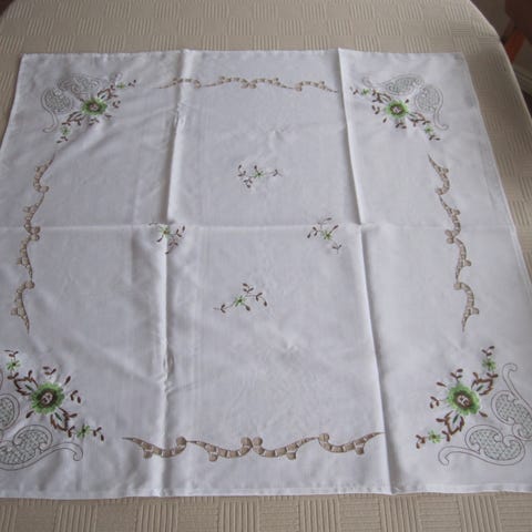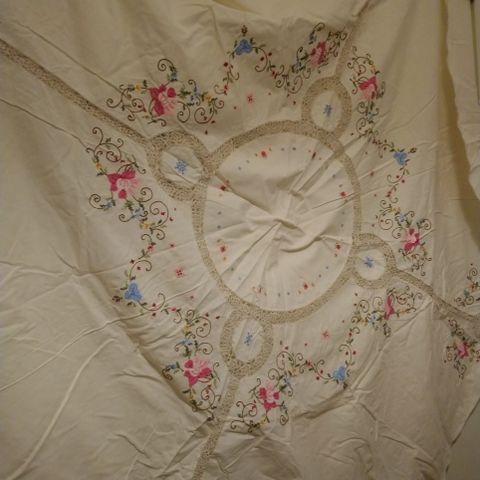 Kaunis kirjailtu pöytä koriste, hapsut, halkaisija 23.5cm.