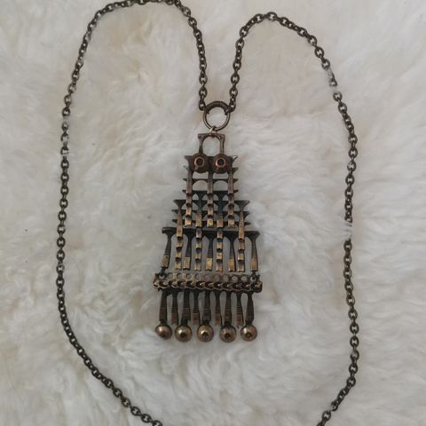 Pentti Sarpanevan suunnittelema pronssinen punoskaulakoru. Leimat P. Sarpaneva, Bronze, Finland. Halkaisija 4 cm, ketjun pituus 60 cm, pituus helppo säätää lukituksella. Kauniissa samettisessa rasiassa.