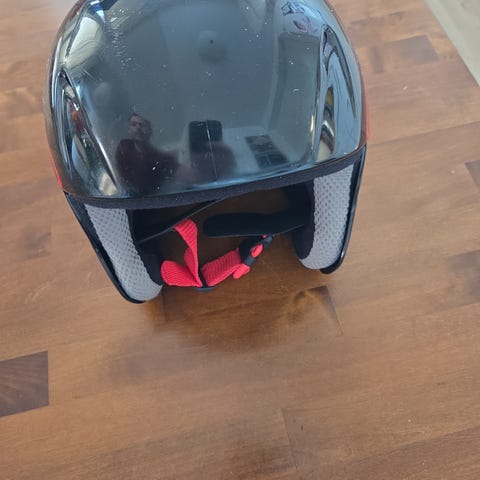 Mustavalkoinen 52-57 kokoa oleva laskettelukypärä, Ilmanottoaukot sivulla ja päällä, takana pidikkeet (urat) laskettelulaseja varten.