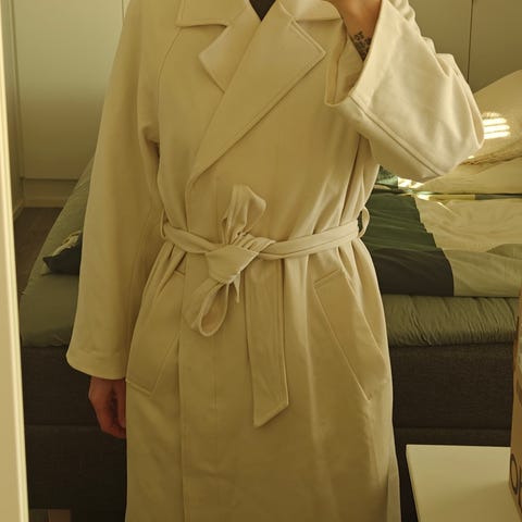 Myydään vain muutamia kertoja käytössä ollut Cinzia Rocca beige välikausitakki, koko L. Takki on täysin käännettävä, toisella puolella on vahva, trenssikangas, toisella puolella ohuempi, hiukan kiiltäväpintainen kuvioitu kangas. Edessä nepparikiinnitys ja kauluksessa nappi. Kainalo-kainalomitta on 65 cm ja pituus 92 cm.
