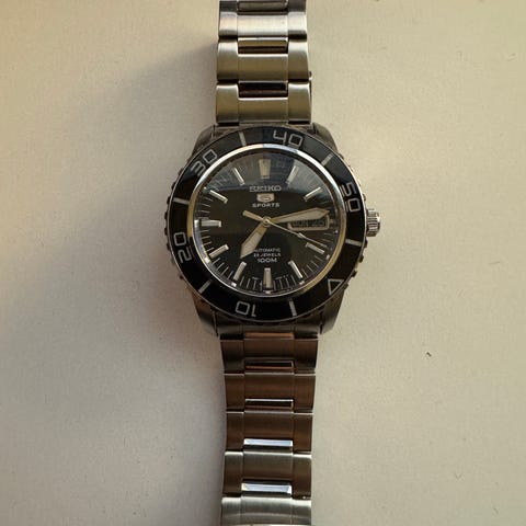 Seiko (Kello)Malli: 5 Sports Viite numero: 7S36-03C0 Käynnistys: Automaattinen Kotelo materiaali: Teräs Hihnamateriaali: Teräs Kunto: OK - Käytön jälkiä näkyvissä. Lisätiedot: Kello on vaihdettu uuteen N36-brändittömään koneistoon. kello ei tullut mukana papereita.