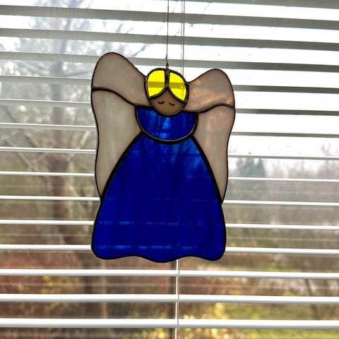 Valkoinen Tiffany lasi enkeli. Korkeus n. 9.5 cm ja leveys n. 7.5 cm.