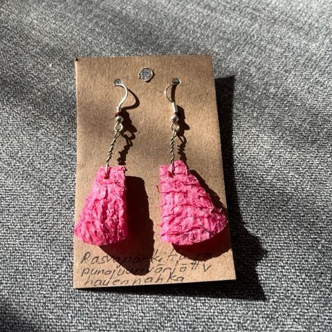 Anette Ahokas Design nappikorvakorut, joissa on käytetty värjättyä kalannahkaa.