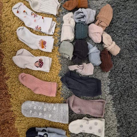 Kahdet paksut sukat koossa 15-18. Toisella puolella kankaassa "hiertymää" valkoisissa, kun vauvan jalat liikkunut turvakaukaloa vasten, ei reikiä. Saat valkoiset sukat kaupanpäälle.