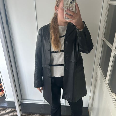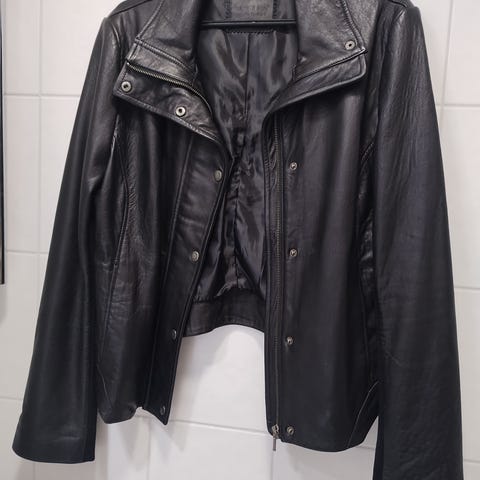 Musta nahkatakki. Reilu koko. Kokonaispituus 69 cm. Ympärysmitta 120 cm. Hihan pituus kainalon alta 38 cm. Hinta 20