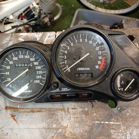 Kawasakin käyttämätön vintage kierroslukumittari volttimittarilla. Ilmeisesti mallin Kawasaki 750 LTD 1981-1983. Lähetyskulut lisätään.