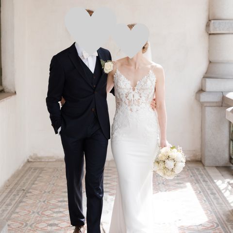 Upea helmi- ja pitsikirjailtu merenneitomallinen Enzoanin Naomi mekko / hääpuku.