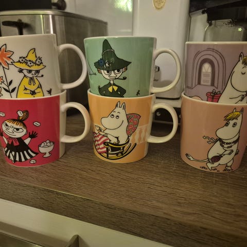 Muumimukit Niiskuneiti ja Runoilija 35e ja Purjehtien 40e.