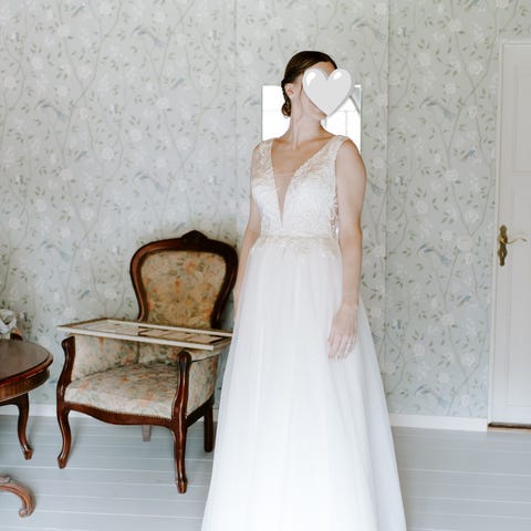 Takana nyörit joiden takia uskon, että useammalle koolle sopiva. Itse noin kokoa 40. Pituus itselläni 159cm ja 5cm korot jalassa. Mekkoa opmpelijalla kavennettu ja lyhennetty, mutta mahdollista palauttaa pituutta noin 15cm. Saa tulla sovittamaan. Hääpuku, häämekko, juhlapuku
