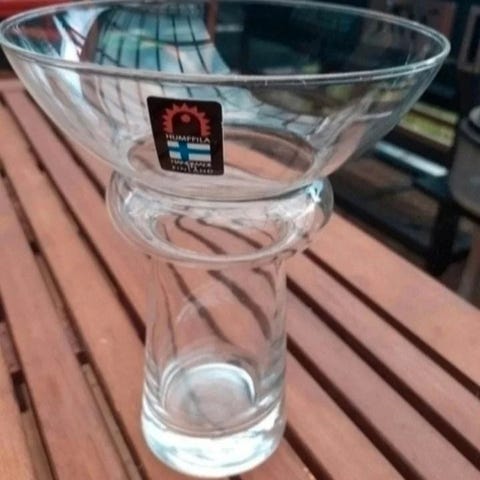 Humppilan lasi, vaasi, 1981 - 1986, korkeus 17cm, yläosan halkaisija n.12,5cm, vähäistä jälkeä kukkavedestä.
