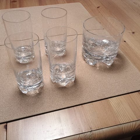 Iittala Full Moon laseja, design Oiva Toikka (lisätietoja http://toikka.kokoelma.fi/listaus.aspx?id=20379).
