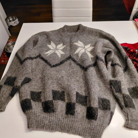 Aidosta lampaan villasta. Käsin kudottu villapusero. Tumman ruskea väriltään. Käyttämätön.