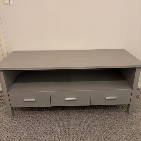 TV-taso, jossa musta taso ja vaaleat puuovet. Tason leveys on noin 120 cm. Sisältää kaksi ovellista kaappia sekä avohyllyn keskellä. Materiaali puu ja laminaatti. Sopii olohuoneeseen televisiovälineiden säilytykseen.