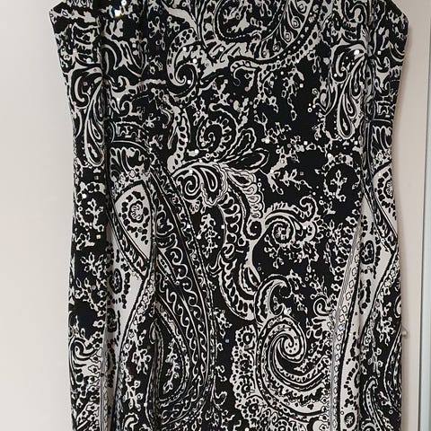 Ribkoffin ruusukuvioinen puna/ musta/ harmaa paljettimekko , kokomerkintä UK 16 eli 40 mutta vastaa kokoa S/M. Kai-kai n.50 cm, vyötärö 43 cm, olka-helma 100 cm. Kotelomekon mallinen, joustava. Upea waterfall kaulus selkäpuolella. Paljetit ovat painettu kankaaseen, eivät sellaisia irtonaisia. Kokeiltu mutta ei käytetty eli uudenveroinen. Postitus onnistuu 8,90 e tai Toridiilillä.