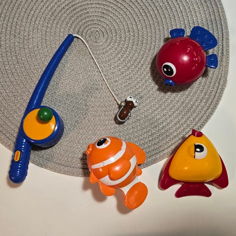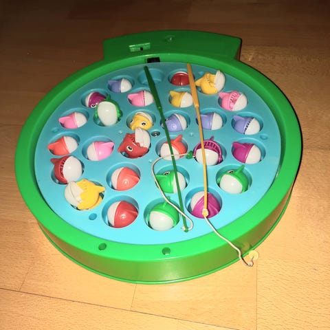 Lasten kalastuspeli, sisältää ongen ja 6 kalaa. Kalojen ylähuulessa on reikä, johon ongenkoukku kuuluu mennä.