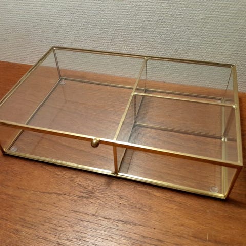 Lasinen säilytysrasia vaikka koruille. Koko n.10x10x5cm. Pinnassa jälkiä ja mustan pohjan väri hieman kulunut.