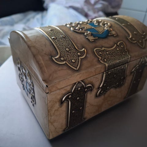 Saranoitu kansi. Koko 7,5 x 20 x 10,2 cm. Ollut keksipurkki.