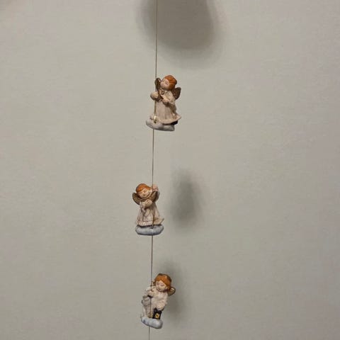 Upea oljesta punottu enkelimobile. Tässä alkuperäiset langat aika lyhkäset, mutta tähän voi virittää esim. silkkinauhasta pidemmän lenkin.