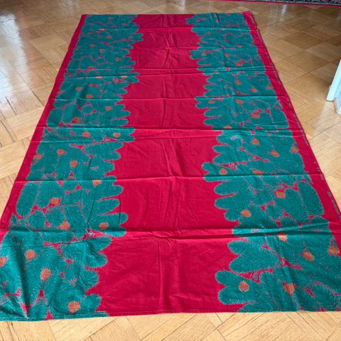 Tätä pidetty verhona. Mitta tuohon alaosan lisäkaitaleeseen 190 cm. Leveys n. 130, reunat ommeltu. Ylhäällä piilokuja valkoisesta kankaasta verhotangolle. Mmm.