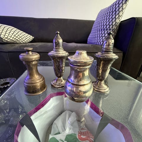 Maustekippo ei alkuperäinen, vaan löysin tilalle kauniimman. Kipon kiinnitys on nyt tulitikun ja sinitarran varassa, mutta vaaka näyttää silti oikein. Ehkä kiinnität oikeaoppisesti.
